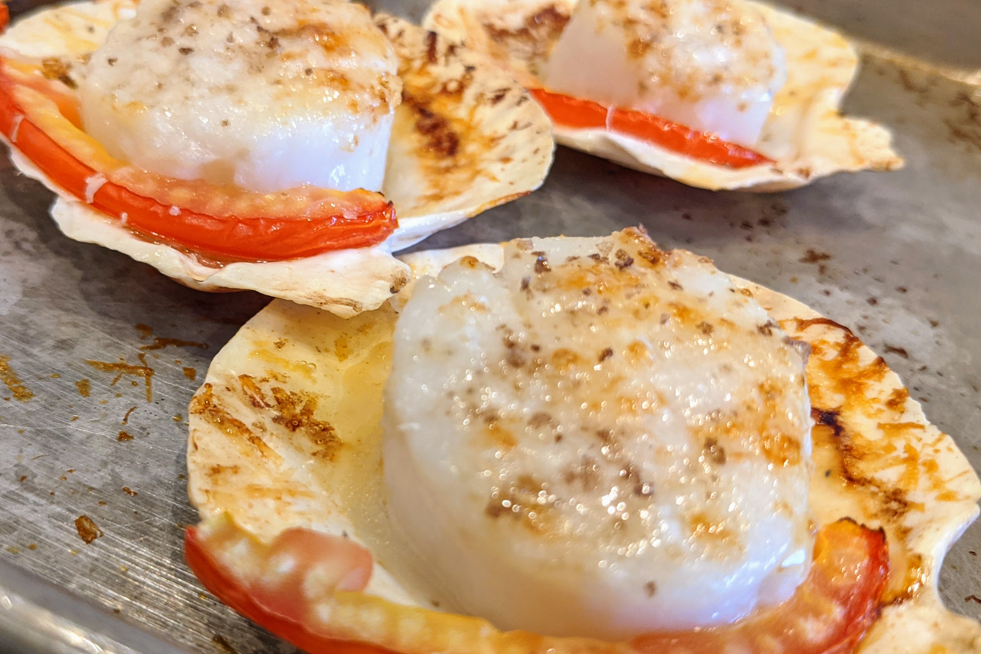 - Position a little slice of tomato, like if it will be wrapping the scallop from the side of the hinge.