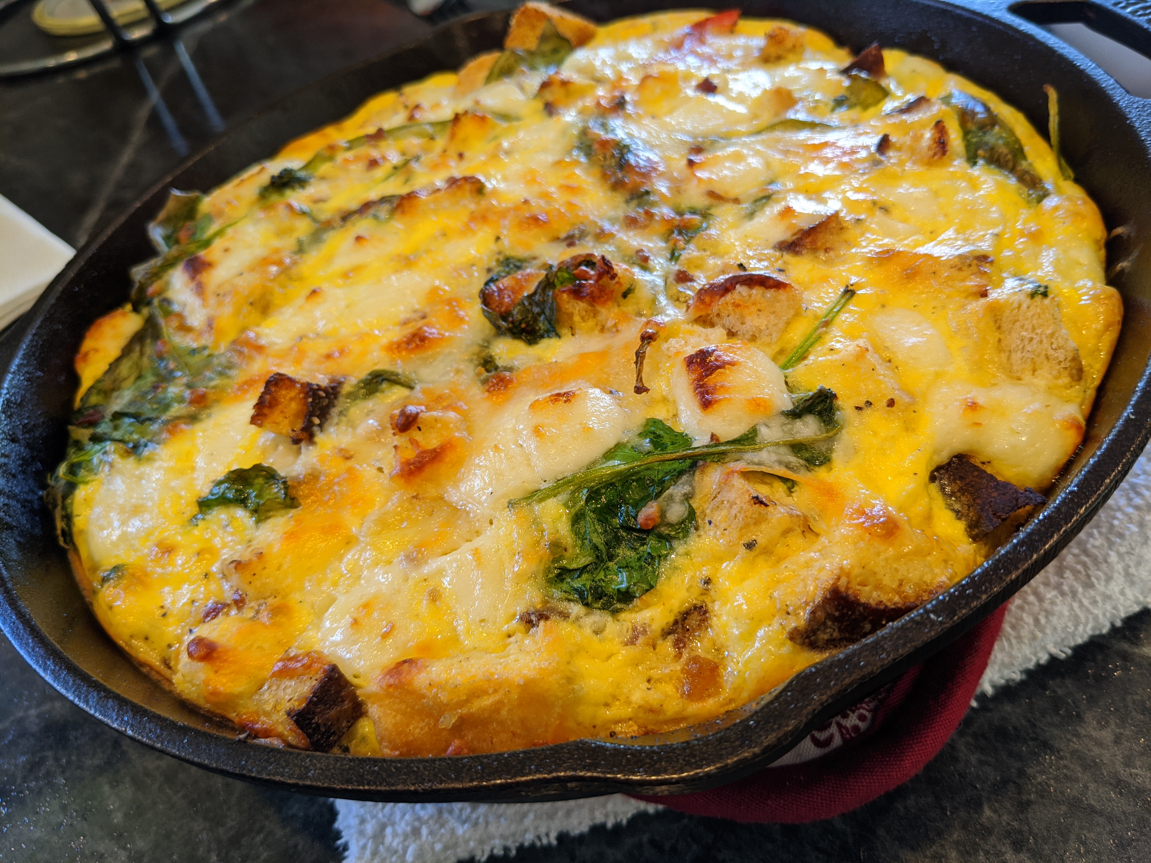 I decide for sautéing all the ingredients including the bread, of course I chose to use a cast iron skillet that can later go into the oven. Left the spinach for last and almost did not wilted it.
